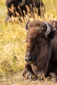 And of course, mind your distance. Twenty-five yards is the official minimum, but let’s be honest: that’s the “barely safe” setting. A long lens keeps you comfortable and, more importantly, intact. Photographing from your vehicle can work well, just make sure you’re parked off the road and out of traffic. If you’re eyeing a bull during the rut, steer clear. Local rental car agencies know all too well what bison damage looks like.