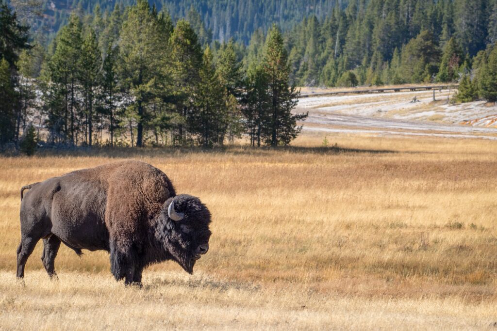 In Yellowstone, bison are possible anywhere, but focus on Lamar and Hayden Valleys; both are home to large herds. Lamar’s rolling sage hills make for layered backgrounds, while Hayden’s wide meadows and morning mist drifting off the river give a sense of scale and serenity. For something different, head to Lower Geyser Basin, Fountain Paint Pot, or Old Faithful. Watching a herd wander through rising geothermal steam feels like photographing a scene from the Ice Age.