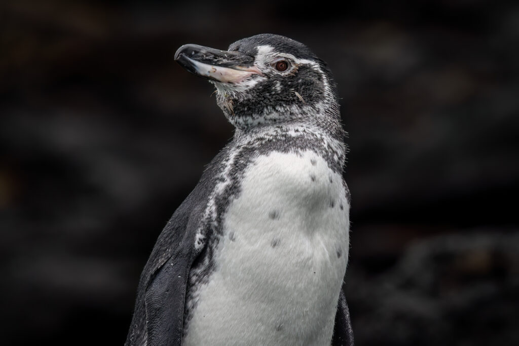 Penguins are the smallest, fastest, and most frustrating of the Big Five. Their black feathers blend into dark lava. Their wet, white feathers catch the sunlight too well. A nightmare for nailing exposure. If you let your camera decide your settings, it will almost always underexpose the bird, robbing the black feathers of texture.